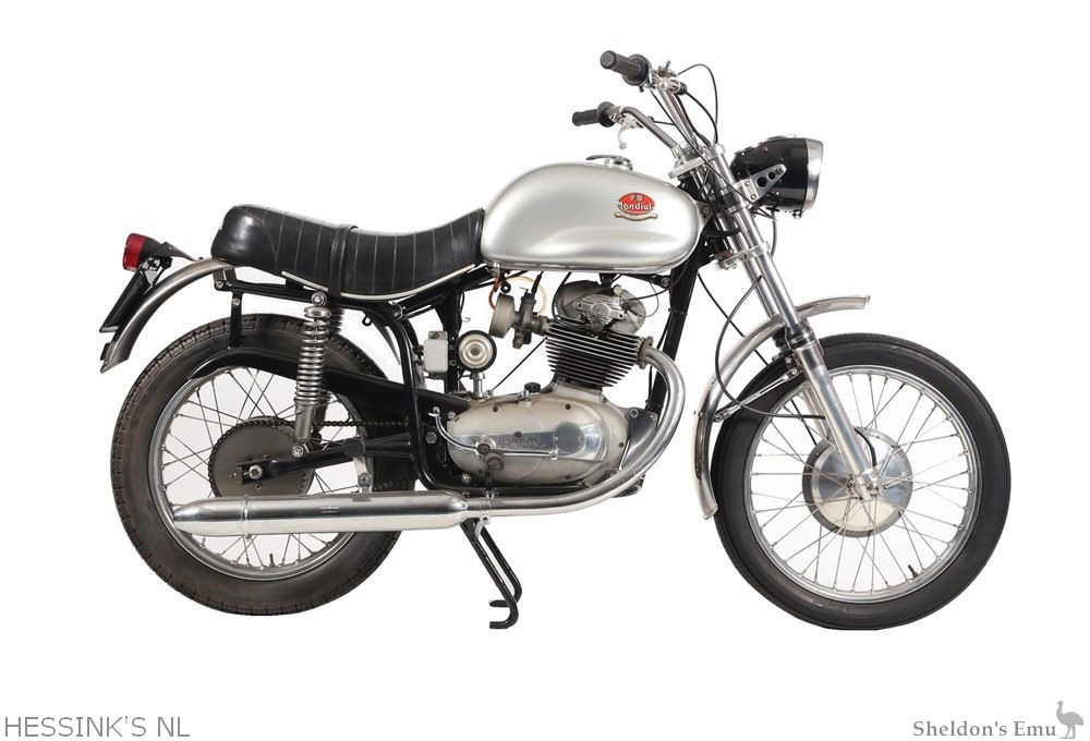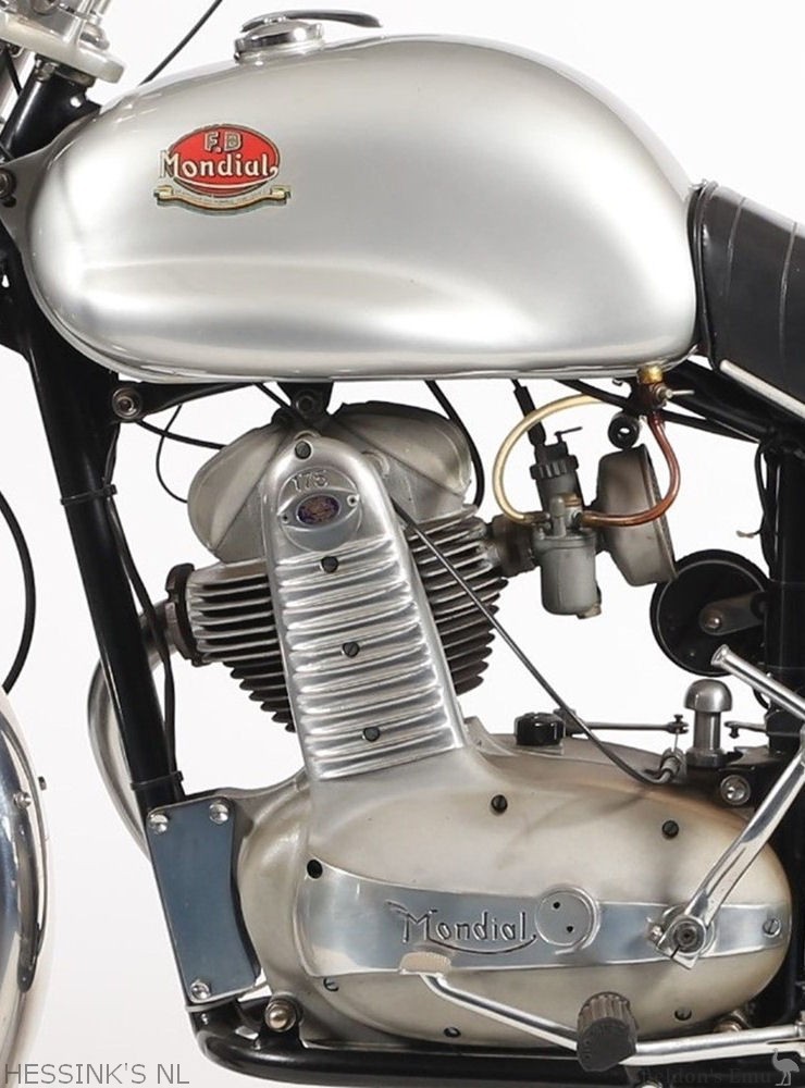 Two versions appeared in 1959, the F.B. Mondial Regolarità 175 and the Regolarità 235. The machine had a dust filter on the carburettor, and a quickly detachable tank and a folding kick-starter were added. The tyre sizes were enlarged, a reinforced frame and steering head were fitted, and the rear swinging arm was shortened to enhance off-road handling.