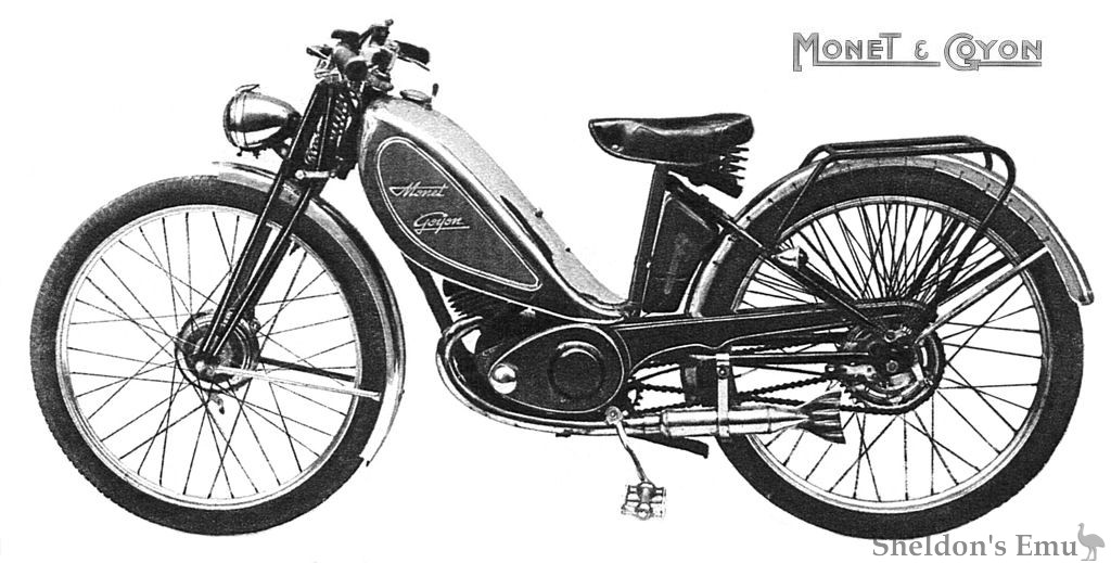 S2 Présentation grand luxe, 2 vitesses. Vendu avec éclairage et miroir rétroviseur. S 3 Présentation « Grand Luxe » et couleur, 3 vitesses. Kick starter. Pneus 600 × 60. Gros phare aérodynamique, garde-boue enveloppants. Fourche avec amortisseurs. Vendu avec éclairage et miroir rétroviseur. UNE VÉRITABLE MотоCYCLETTE.