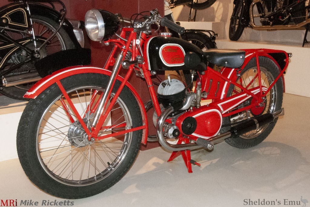 Mêmes caractéristiques que le modèle M S. cadre brasé, réservoir 7 litres, mais équipé avec le nouveau moteur VILLIERS à piston plat, breveté, 2 échappements réels et latéraux, Ce type S est caractérisé par une plus grande souplesse, meilleur rendement, échauffement nul. Longs tuyaux. Silencieux efficaces. Garde-boue AV long et à bavette.