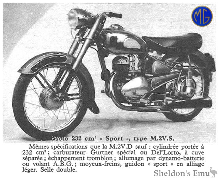Same specifications as M.2V.D except; cylinder increased to 232 cm3; Gurtner special or Dell'Orto carburetor, separate bowl; blunderbuss exhaust; ignition by battery dynamo or A.B.G. flywheel; hub-brakes, light alloy 'sport' handlebars. Double saddle.