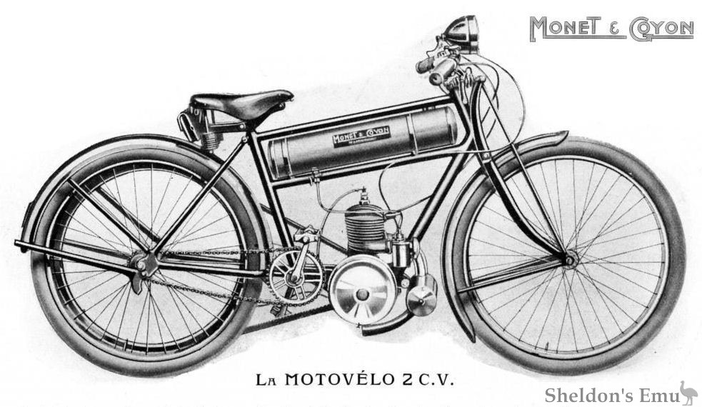 This is cycle attachment was built under licence and was also available from BSA. The Monet-Goyon version came with 117cc, 119cc and 124cc twostroke engines. The device attached to the rear wheel of a bicycle and gave a top speed of up to 30km/h. Also known as Motor-Wheel and Roue-Motrice.