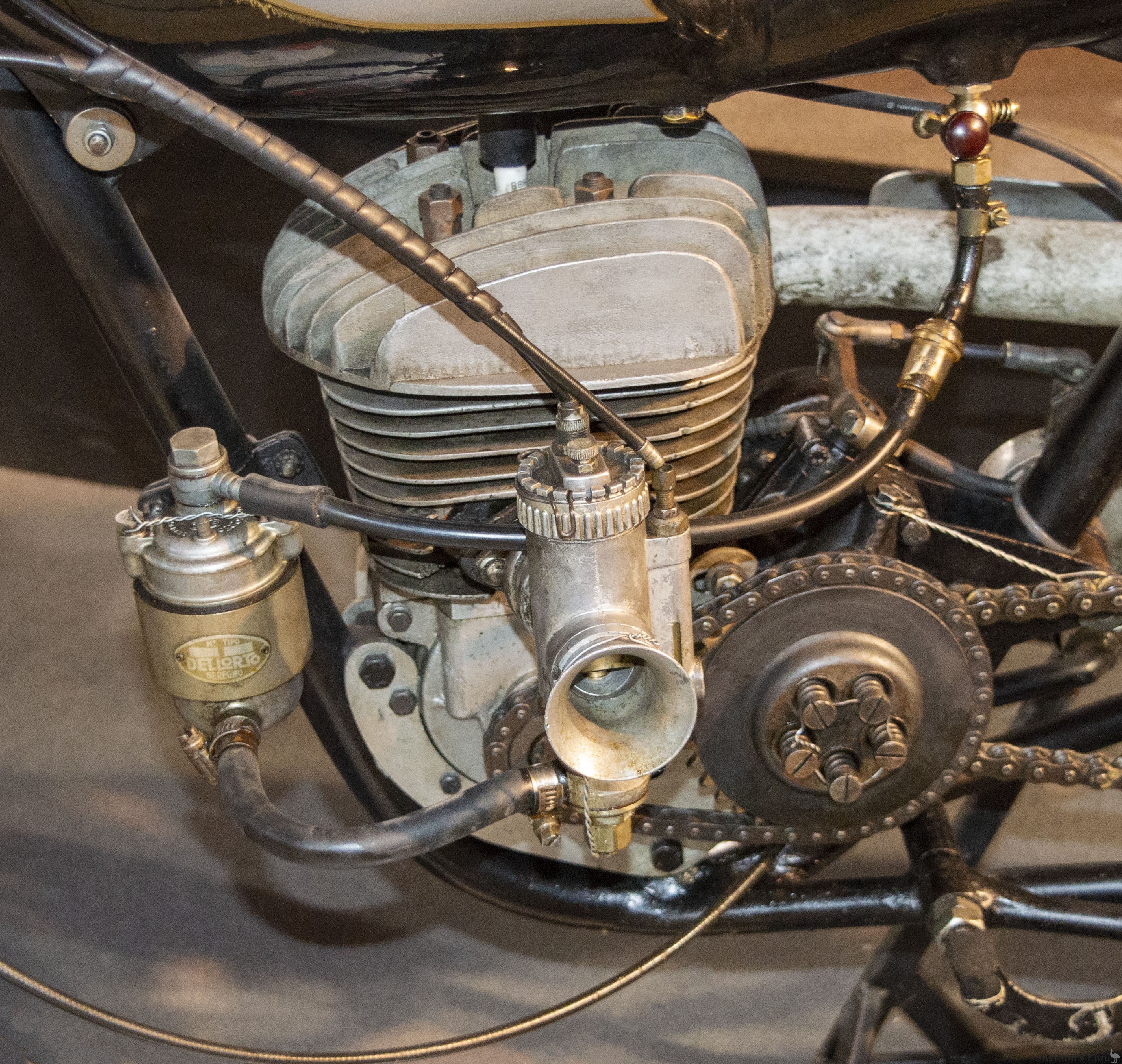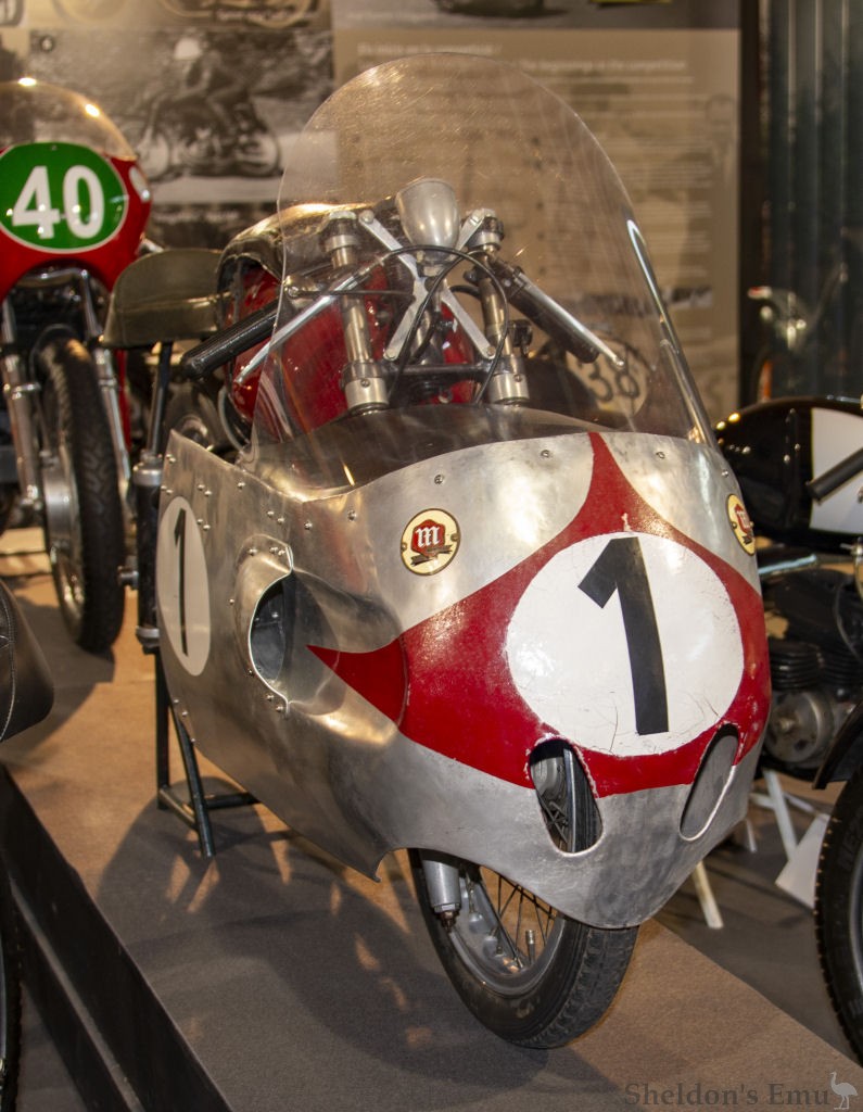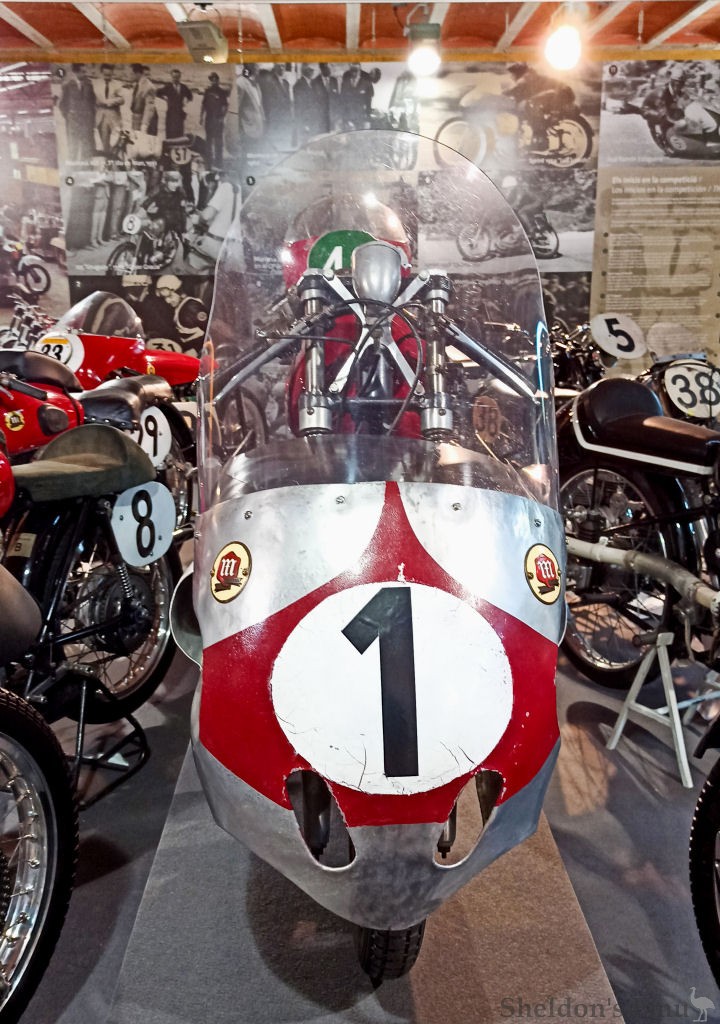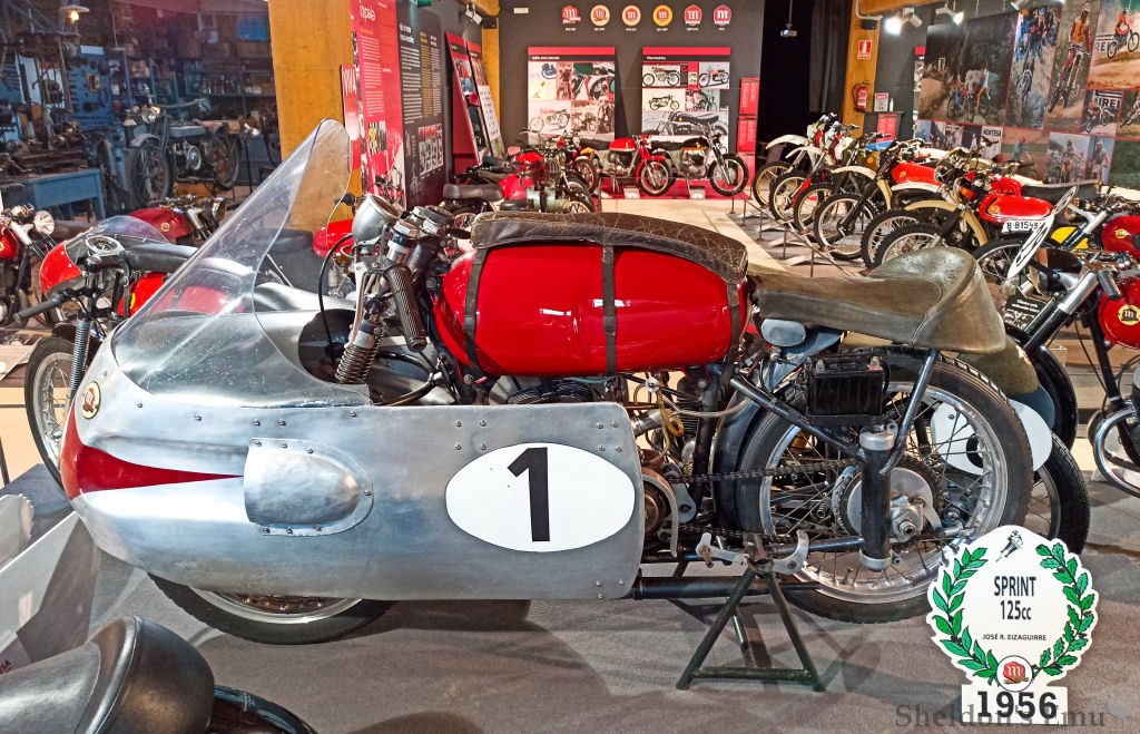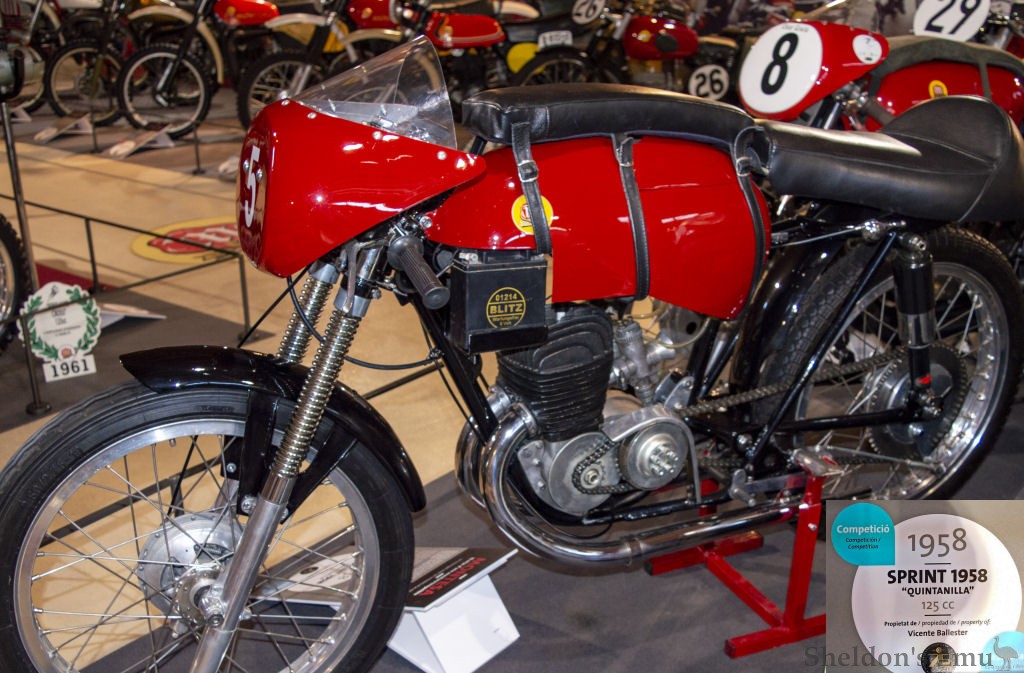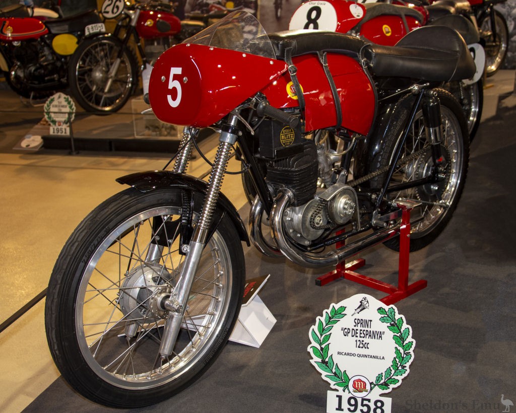 The last of the racing versions of the 125 cc Sprint, the 1958 version with which the rider Ricardo Quintanilla participated in the Spanish GP in Montjuïc, this unit developed 18 HP at 11,000 rpm and, until it broke down, was ahead of Carlo Ubbiali’s MV. It has a Dell'Orto SS 30 carburettor, 124.5 cc displacement with dimensions of 51.5 x 60mm and a six-speed gearbox.