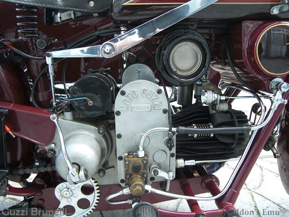 From a commercial perspective the choice certainly accurate as the motorcycling fraternity, who at the time looked upon with suspicion machines with rear suspension - especially sports machines - as they had earned a reputation for poor stability; they did not react negatively to this evident step backwards by Moto Guzzi. Quite the opposite - the Sport 15, with such modern lines and a brilliant engine, achieved extraordinary success, so much so that it became the best-selling model of the Mandello company in the period between the two wars, and remained in the catalog constantly from 1931 to the end of 1939. The engine, a half-litre horizontal single-cylinder with opposed valves, was the same as the Sport 14, except for the adoption of an I-shaped connecting rod instead of the previous one in steel tube.