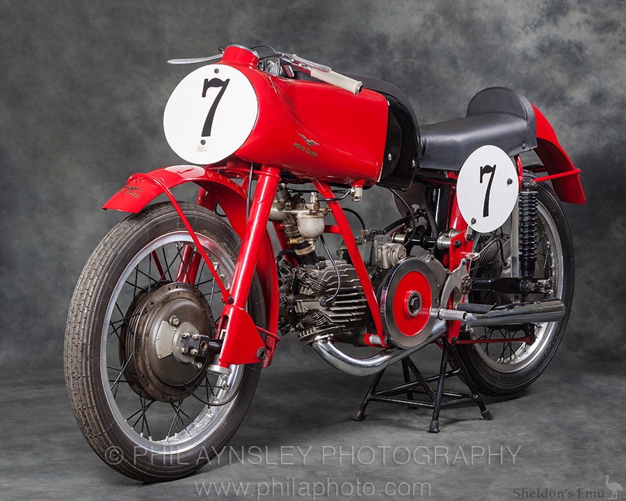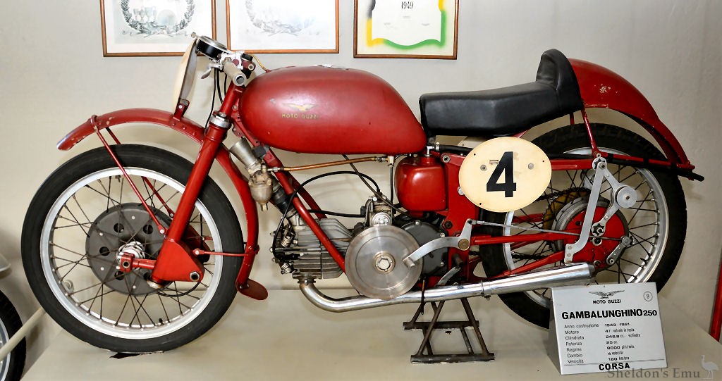 It was succeeded in 1952 by the 250 Bialbero, but privateers continued to race the Gambalunghino for many years - in 1962 Arthur Wheeler achieved a remarkable 3rd place in the World Championships, with Jim Redman and Bob Macintyre taking 1st and 2nd riding for the Honda team. Wheeler's machine benefitted from a Ken Sprayson frame, he of "Featherbed" fame.