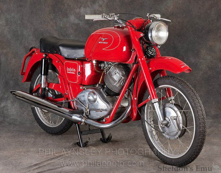 Manufactured 1956-1966, the Lodola was the last motorcycle designed by Carlo Guzzi before he retired. Announced at the Fiera Milano in April 1956, it was initially fitted with a 45 degree inclined OHC 175cc engine. This was followed by a sport version with higher compression and a dual seat, and in 1959 the displacement was increased to 235cc using an OHV power unit for the Gran Turismo (GT235) model. All models had a four-speed gearbox, and wheels were 18 inch front and 17 inch rear, with drum brakes.