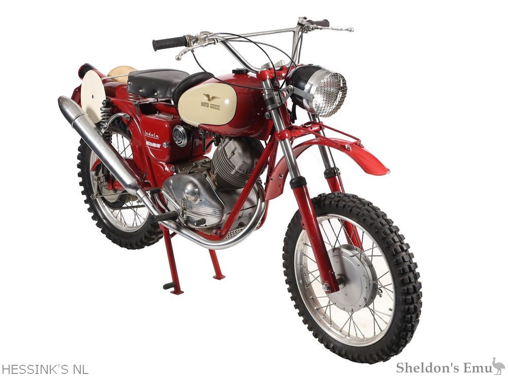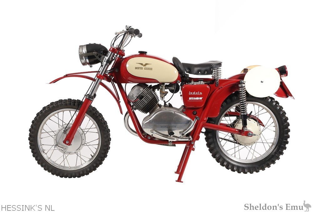 They threw themselves into the International Six Days Trial, a series of gruelling tests of machine, rider skill, and reliability for the 'Regolaristi' riding their off-road machines. With a few adjustments, the Moto Guzzi Lodola was combat-ready in 1958. The Six Days Trials models were equipped with stronger front forks, vertical rear shock absorber with external coil springs, higher handlebars, raised mudguards and exhausts, studded "trials" tires and more sturdy saddle.