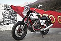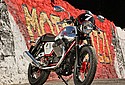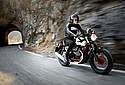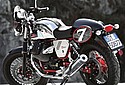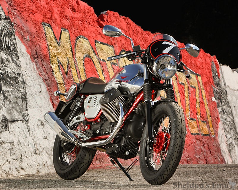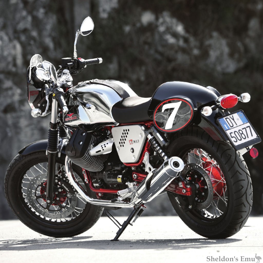 The Moto Guzzi V7 Racer features a 750cc, 90-degree V-Twin engine along with a chrome fuel tank, red frame, and suede saddle. It also has adjustable billet rear sets, lightweight triple clamps, and Bitubo rear suspension units with adjustable spring preload, rebound and compression damping.