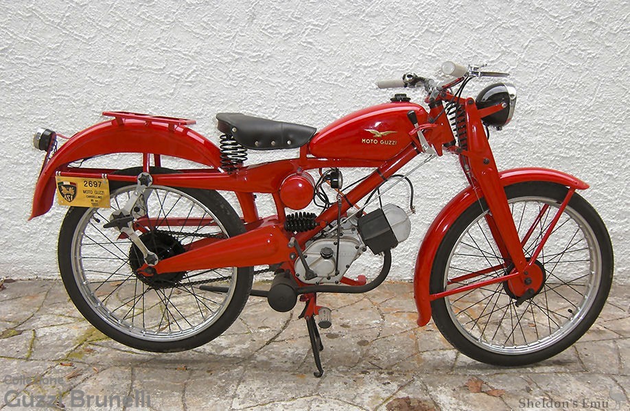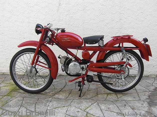 The motorcycle evolved from the Guzzino, which had been in production since 1946. The most notable change from the "65" was the frame, modified with the insertion of two sheet metal braces to support the rear mudguard. The rear suspension also benefited from two shock absorbers. Other changes concerned the tyres (20in Instead of 26in), the luggage rack (on the rear mudguard instead of the tank) and the carburettor (still Dell'Orto, but with a 14 mm throat).