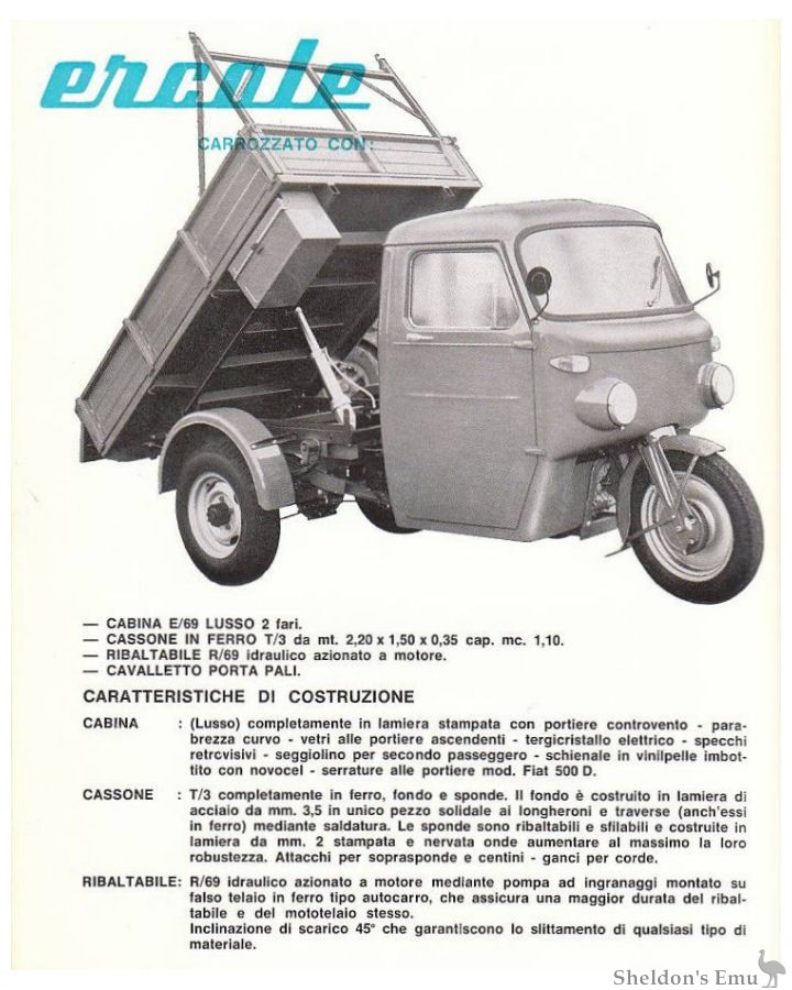 The Ercole (EN=Hercules) motocarri was produced from 1946 until 1980. It was heavier than its predecessors, load capacity was increased to 1500 kg, and it had an upgraded bevel-gear transmission.