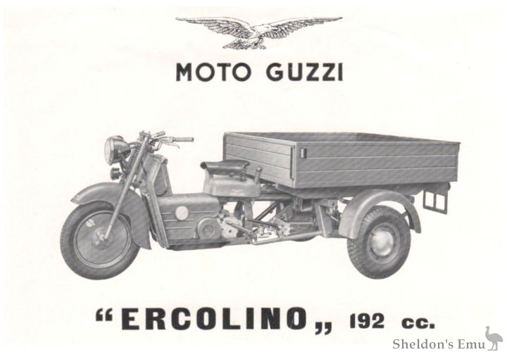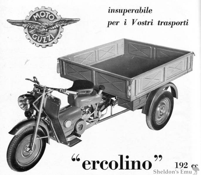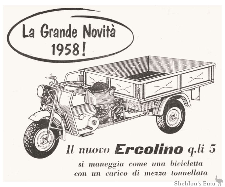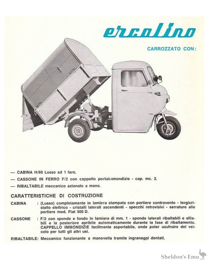 The Ercolino tray had folding sides, and some versions were fitted with a full cabin similar to that of the Piaggio Ape and others.