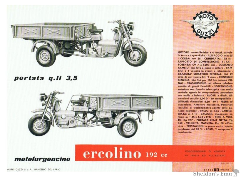 The 1956 Ercolino was powered by a modified Galletto 192cc engine fitted with fan cooling and a four-speed gearbox with reverse gear.