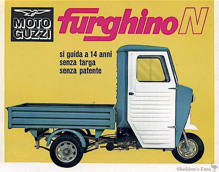 Compared to the Dingotre, the Furghino that replaced it in 1968 featured final drive by shaft, giving increased rider saftey and lower maintenance costs. The engine, which was derived from the three-speed Dingo 50 with fan cooling - was mounted below the driver's seat and arranged transversely so that the transmission shaft remained in axis with the gear train.