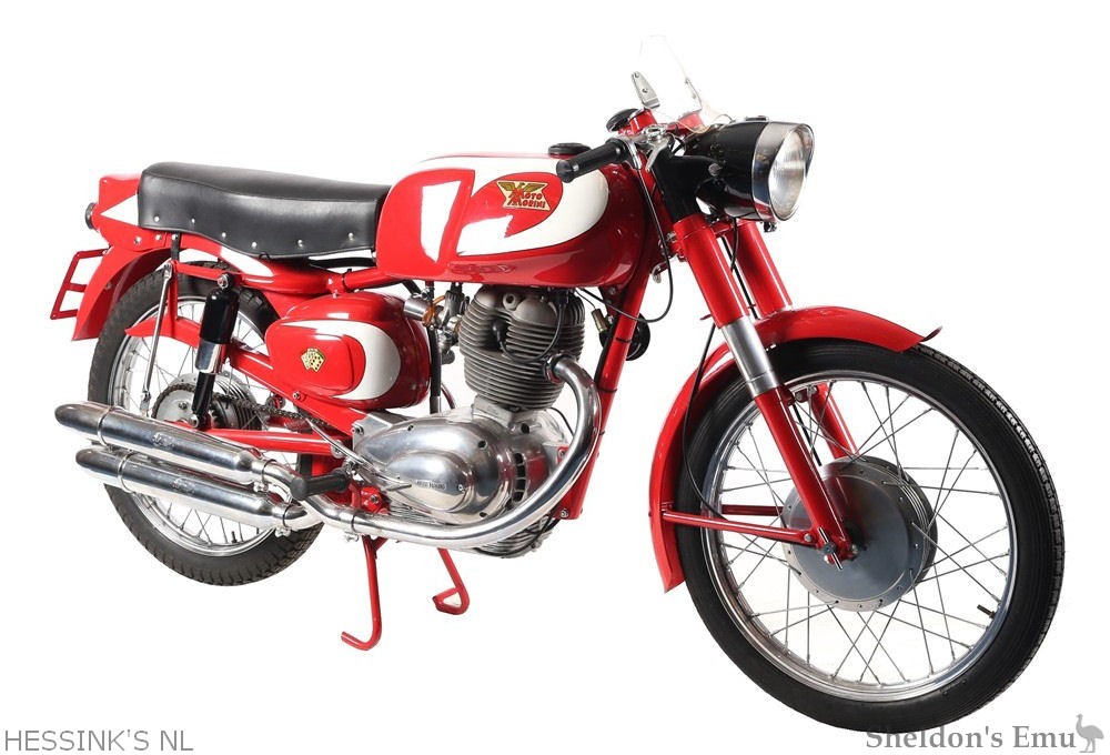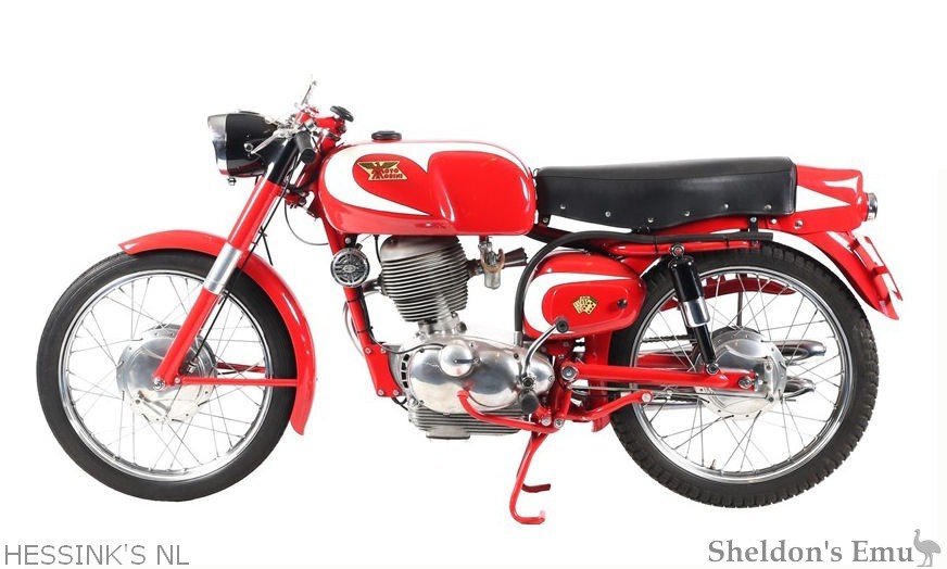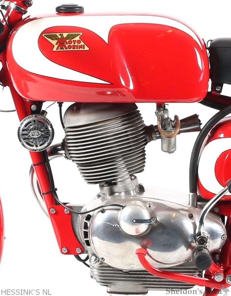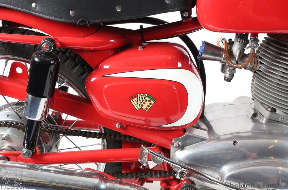 Introduced for the 1954 model year at the same time as the GT, one of the most famous of the latter was the Settebello (Seven of Diamonds) that commenced a run of models named after card games popular in Italy. Although intended for production-class racing, the Settebello was sold with full road equipment and could be distinguished from Morini's other 175 models by its larger cylinder head containing hairpin valve springs (all the others used coils). Following the budget-priced Briscola (trumps) the last of the card game-themed 175s was the Tresette (Three Sevens) which was newly introduced for 1958 together with the sporting Tresette Sprint. Distinguishable from the 'cooking' Tresette by its camshaft-mounted ignition points, the Sprint incorporated a high-compression piston and 22.5mm Dell-Orto carburettor and produced 13bhp @ 6,500 rpm, an output good enough for a top speed of 73mph.