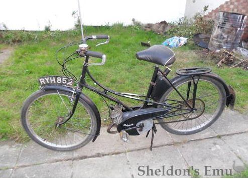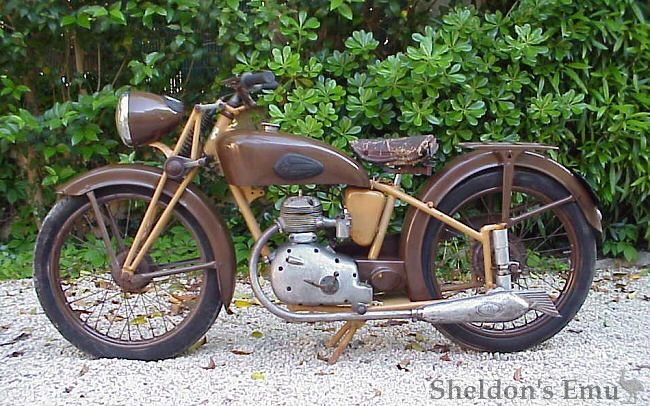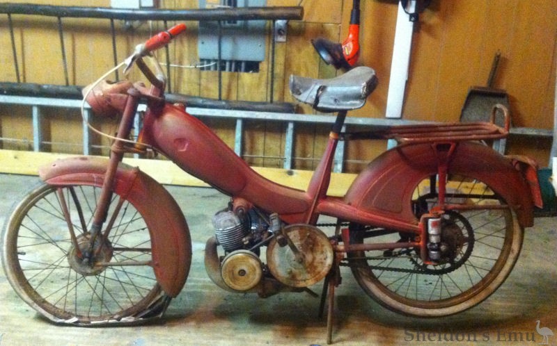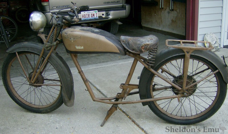 Anyone ever hear of a "Motoonfort? There is one at a local Antique Mall here in Norfolk, and they are asking $2900 for it. Me thinks this is a bit high, I would only give $500 for it myself. This is one neat bike, it looks very 30'ish. Bike has : 125cc two stroke with a exposed chrome spinning flywheel-magneto, a fishtail exhaust muffler, two speed tranny w/hand shift, both foot and hand clutch, the frame is a rear plunger type, front fork is a twin cantilever springer with adjustable binders as shocks, has a solo saddle with pillon clamped onto the luggage rack.