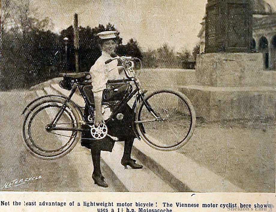 From 1900 the company produced a bicycle auxiliary engine which was supplied with a sub-frame that could be installed into a conventional bicycle. This looked like an engine in a bag, hence the Motosacoche name which translates as meaning "engine in a satchel".