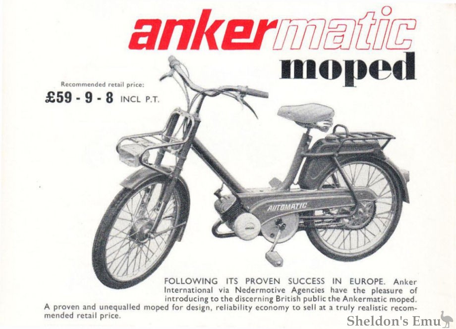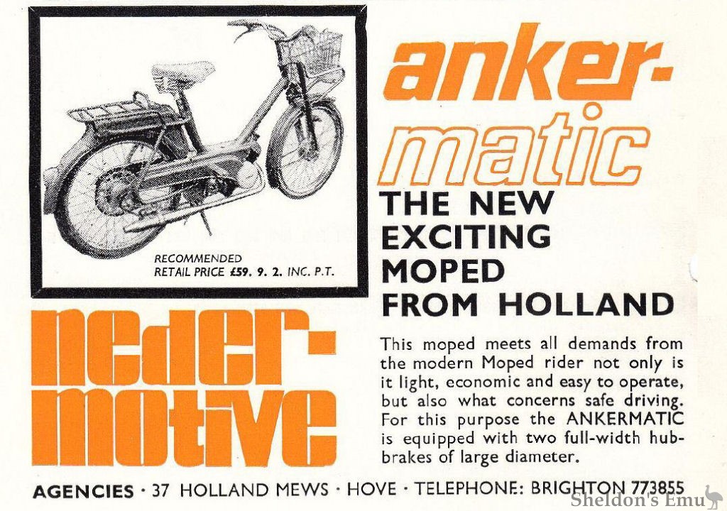 "Holland's largest and most important single producer of moped engines and mopeds, N V Anker Motoren Maatschappij of Rotterdam, is to market the Anker Automatic moped in Britain. Appointed to handle sales and distribution in the UK is a completely new company, Nedermotive Agencies, formed and controlled by former NSU moped sales manager David Startup.
