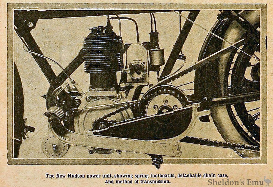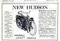 New Hudson Cycle Co, Birmingham. Two very serviceable looking motor-bicycles are to be seen here, one fitted with a vertical 2 h.p. De Dion engine, embodying all the latest improvements, including their special silencer. The motor is clamped to the down tube, and in addition is supported behind from the bracket and seat tube. A special point about this motor is that it gives a much narrower tread than usual.