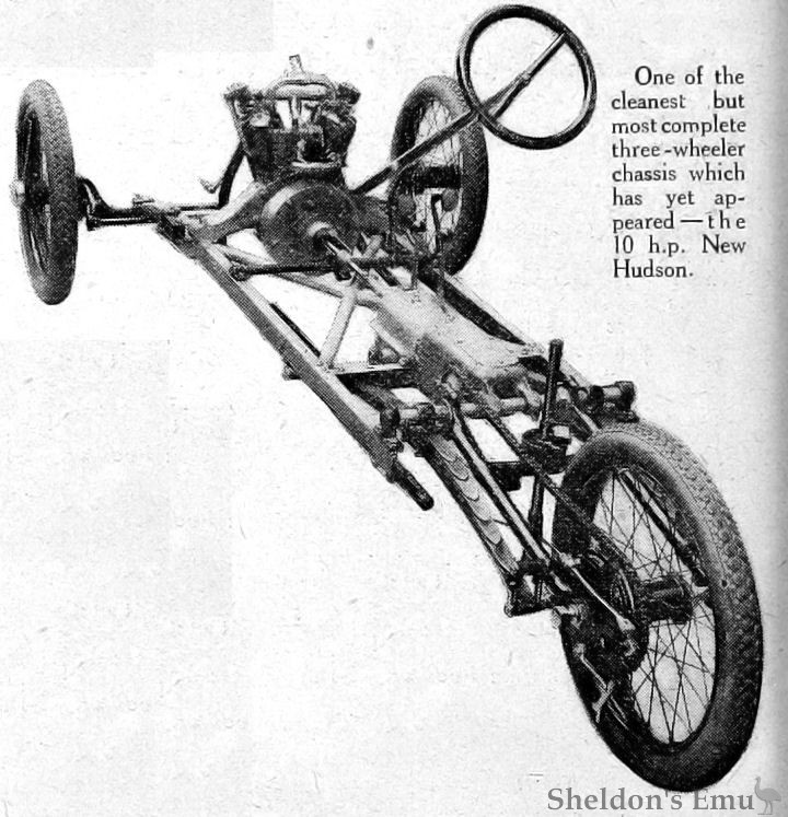 One of the cleanest but most complete three-wheeler chassis which has yet appeared - the 10 h.p. New Hudson.