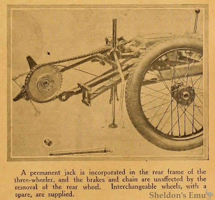A permanent jack is incorporated in the rear frame of the three-wheeler, and the brakes and chain are unaffected by the removal of the rear wheel. Interchangeable wheels, with a spare, are supplied.