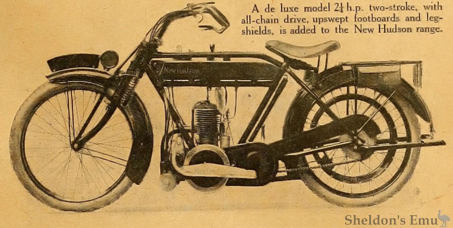 A de luxe model 2¼ h.p. two-stroke, with all-chain drive, upswept footboards and legshields, is added to the New Hudson range.