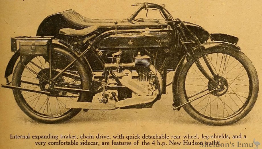 Internal expanding brakes, chain drive, with quick detachable rear wheel, leg-shields, and a very comfortable sidecar, are features of the 4 h.p. New Hudson outfit.