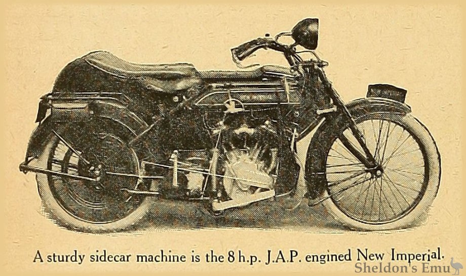 As a substantial and powerful machine for sidecar work, the 8 h.p. twin J.A.P.-engined New Imperial is a good example. Brampton forks are fitted to this model, with 28in. wheels, and completely enclosed all-chain drive. An introduction this year is the use of curved knee-guards, which enhance rather than detract from the appearance of the machine.