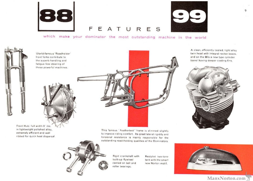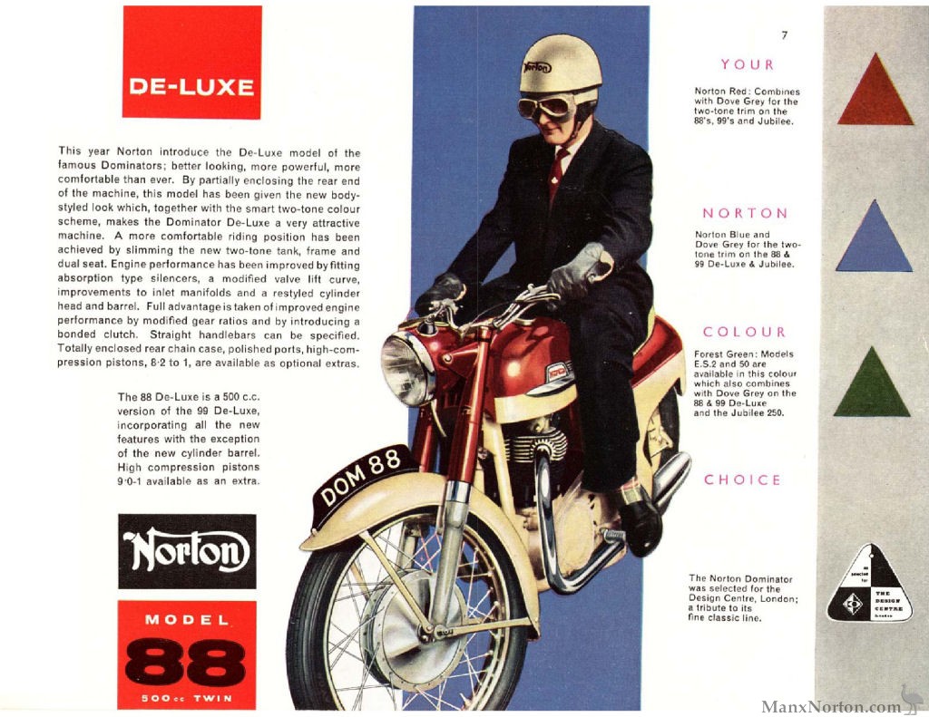 This year Norton introduce the De-Luxe model of the famous Dominators - better looking, more powerful, more comfortable than ever. By partially enclosing the rear end of the machine, this model has been given the new body-styled look which, together with the smart two-tone colour scheme, makes the Dominator De-Luxe a very attractive machine. A more comfortable riding position has been achieved by slimming the new two-tone tank, frame and dual seat. Engine performance has been improved by fitting absorption type silencers, a modified valve lift curve, improvements to inlet manifolds and a restyled cylinder head and barrel. Full advantage is taken of improved engine performance by modified gear ratios and by introducing a bonded clutch. Straight handlebars can be specified. Totally enclosed rear chain case, polished ports, high-compression pistons, 8-2 to 1, are available as optional extras.