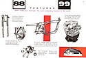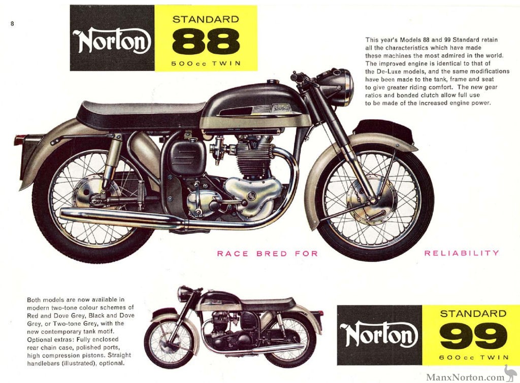 This year's Models 88 and 99 Standard retain all the characteristics which have made these machines the most admired in the world. The improved engine is identical to that of the De-Luxe models, and the same modifications have been made to the tank, frame and seat to give greater riding comfort. The new gear ratios and bonded clutch allow full use to be made of the increased engine power.