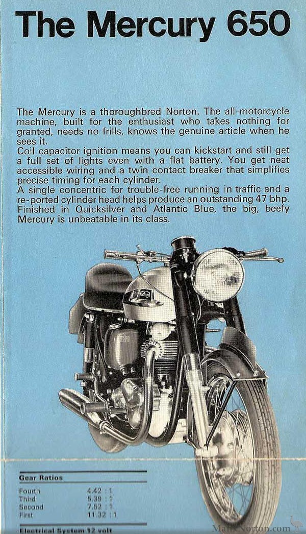 With a 646cc OHV parallel twin engine fitted to a Featherbed frame, the Mercury was marketed by Norton-Villiers in the years 1968 to 1970. The engine had much in common with that of the 650SS, it had 12v electrics, Roadholder forks, and an 8" front brake.