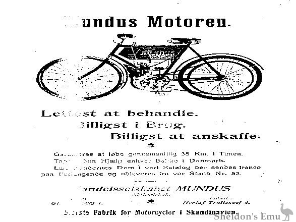 John Olaf Anderson ran the Cycle & Sports business A\S Mundus in Verdalen (@550km east of Oslo) around 1910. He sold bicycles and motorcycles under the Mundus brand. The Mundus bicycle engines were imported from the Elleham firm in Denmark, and it is thought that Anderson may have assembled complete machines.