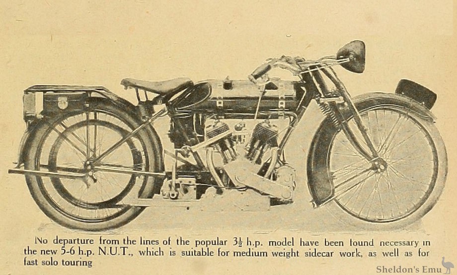 The N.U.T. made its first public appearance at the Olympia Motor Cycle Show of 1919, and there attracted a considerable amount of attention amongst the sporting fraternity, as it was designed as the "last word" in solo mounts. It is interesting to note that the manufacturers have found no reason to modify their design.