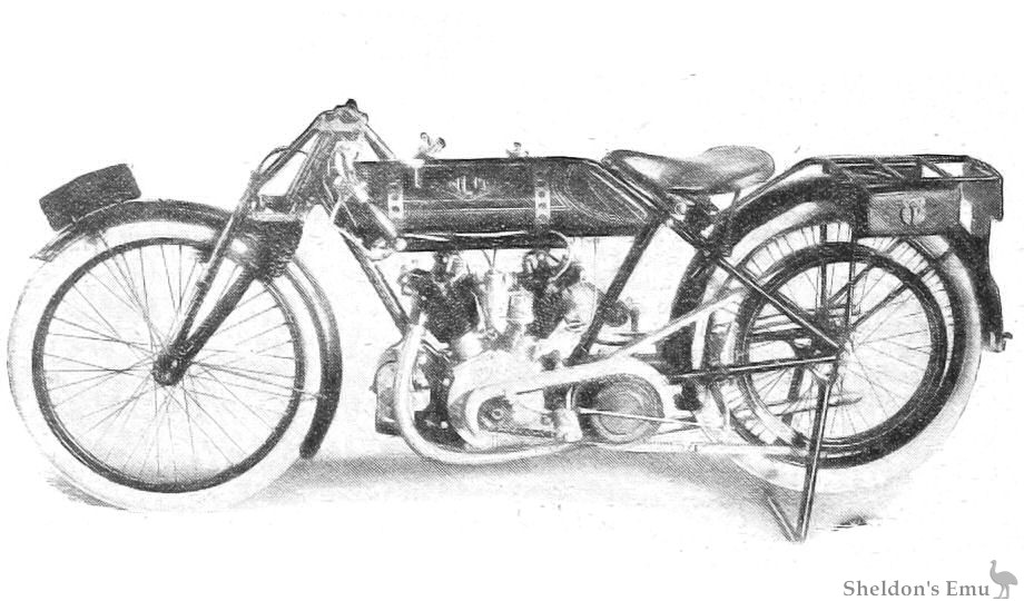 At the Olympia Show in late 1920 they introduced a sporty (yet luxurious) twin-cylinder machine with three-valve cylinder heads. The 1921 catalog consisted of three basic models, the 3 ½ HP Touring Model, the Sport Model TT of 3 ½ HP and the dual purpose 5 HP model. Electric lighting was available for an extra £20 for touring motorcycles (the standard 3 ½ HP cost £100) and for an additional £10 final drive by chain was offered as an option.