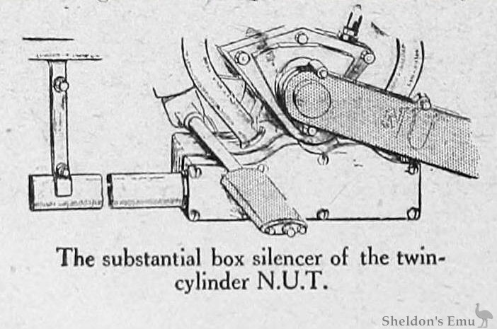 Primarily, the N.U.T. design was intended to represent the best that could be made as a purely solo machine, but it has been found that a number of users desired to attach light sidecars. When this has been done, the charm of the machine has been somewhat decreased, but it is well known that the small V twin engine owes its popularity to such qualities as smooth running, quick acceleration, and the ability to maintain high average speed with little apparent effort. These qualities, however, are almost at once sacrificed if an engine of this type is unduly overloaded, since it does not possess the "slogging" power of a single-cylinder engine of the same cubic capacity.