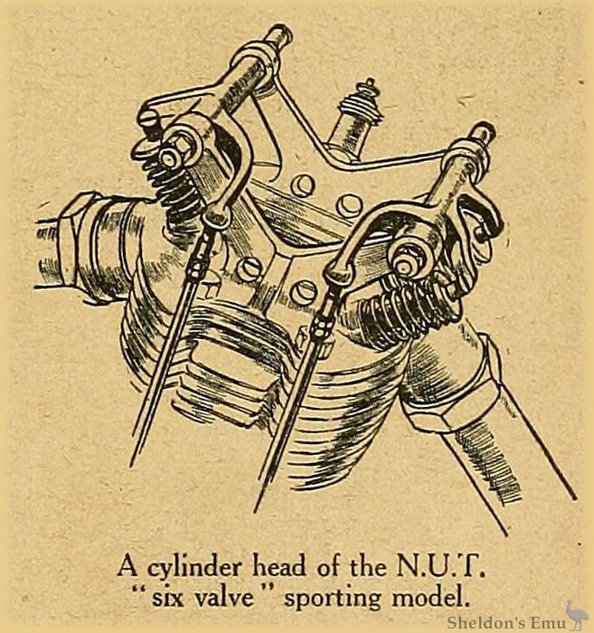 In addition to the two machines mentioned, a new line, which will appeal especially to the sporting fraternity, is the 3½ h.p. overhead valve model. The dimensions of the V twin engine are the same as the standard 3½ h.p. (64.5 x 76 mm.), but the engine is of a special racing type, having one inlet and two exhaust valves per cylinder, these being carried in detachable heads. The specification of the machine remains much the same as that of the 3½ h.p. model, since the frame and transmission are similar. There are some departures in detail, however; for instance, the Magdyno gives place to. a simple magneto, while, instead of the complete chain case on the primary drive, a light cover is fitted over the top run of the chain. The spring forks, mudguards, and handle-bars are of the racing type. In other respects the finish and appearance conform to the general high standard which characterises all the N.U.T. products.