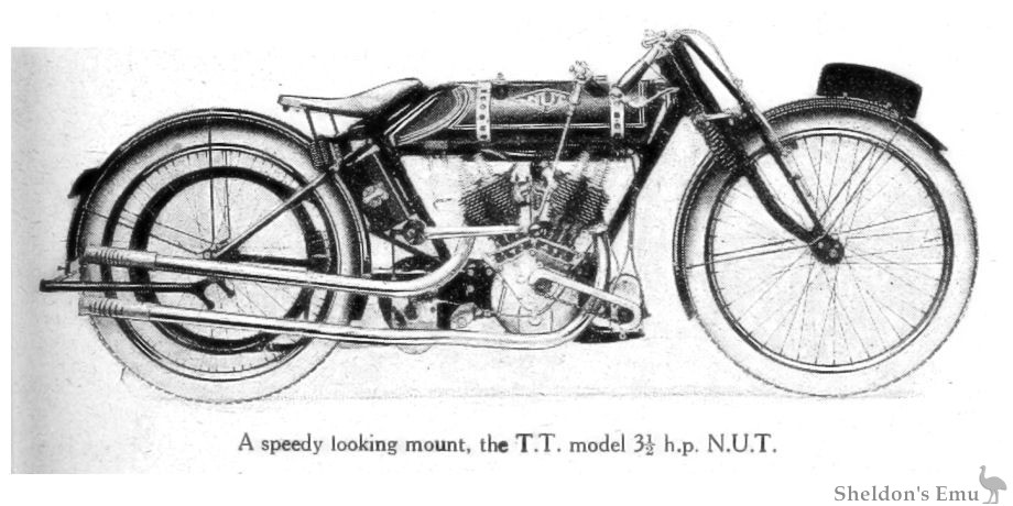 Very little alteration has been found necessary in the 3½ h.p. J.A.P.-engined N.U.T., which was designed essentially as a smooth-running speedy solo mount : all-chain drive, however, is now offered as an alternative to the original chain and belt layout. A small item of the specification is the leading of the crank case relief valve outlet from the timing gear to the primary chain case, thus keeping the engine cleaner, and at the same time lubricating the chain. Generally, the policy of the designer is to clean up details and to aim at standardising nut and bolt sizes, etc. A well thought out toolkit has been got together, and an oil (can?) is carried in the handle-bar stem, while a squirt is fitted in the petrol-filler cap.
