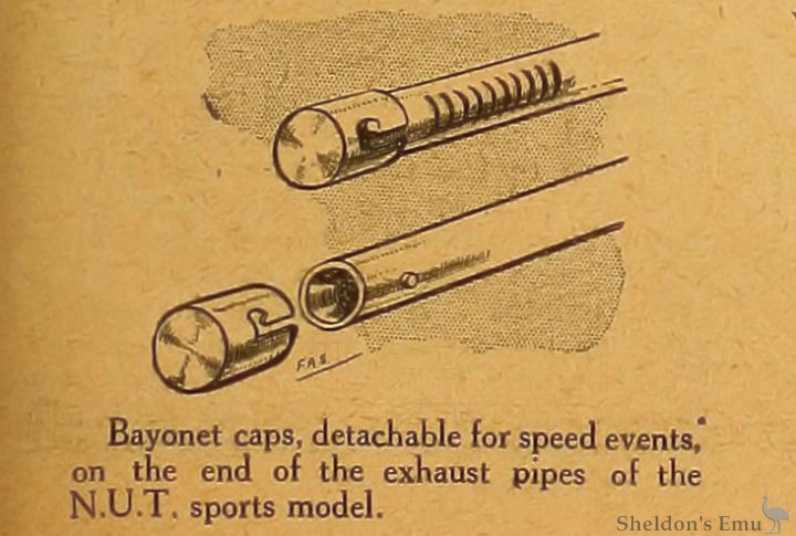 Bayonet caps, detachable for speed events, on the end of the exhaust pipes of the N.U.T. sports model.