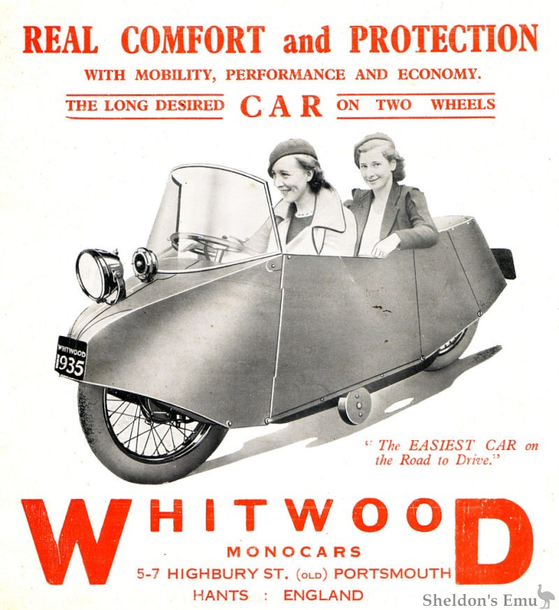 1934 OEC announced the Whitwood, a two-wheeled car. A model was announced that was fully enclosed, and from the side it resembled a small saloon car with a short bonnet - or a very large sidecar. It carried two people in tandem and had a stabilising, out-rigger wheel on either side. In many respects it resembled the Atlanta as, under the body, it had a tubular frame and the OEC duplex steering system, but controlled by a steering wheel. The engine and gearbox went under the seats and the engine ranged from a 150cc Villiers to a 750cc V-twin JAP.