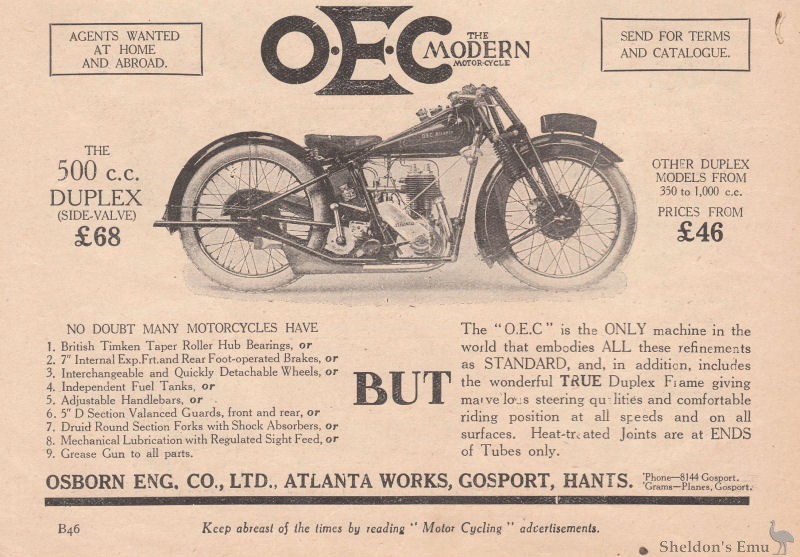 1927 That association led to an increase in the range, with models using the famous Temple name, and that year another novelty arrived in the shape of a patent duplex steering frame. This had bottom frame-rails extended forwards and outwards to give turning clearance on full lock. That, and other unique features of the design, resulted in it being called the OEC-Duplex - a name that was used until 1940.