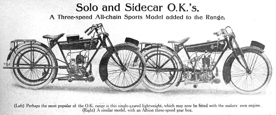 An O.K. engine, which has a bore and stroke of 70x76 mm. (292 c.c), only will be fitted to the sidecar outfit, and, with an Albion three-speed gear box with clutch and kick-starter, it makes an economical, handy, and capable little passenger machine. It sells complete at £96 12s. An identical model without the sidecar is priced at £71 8s.; while an entirely new departure for next year will be a three-speed all-chain drive sports machine, also with an O.K. engine, which is listed at £69 6s.