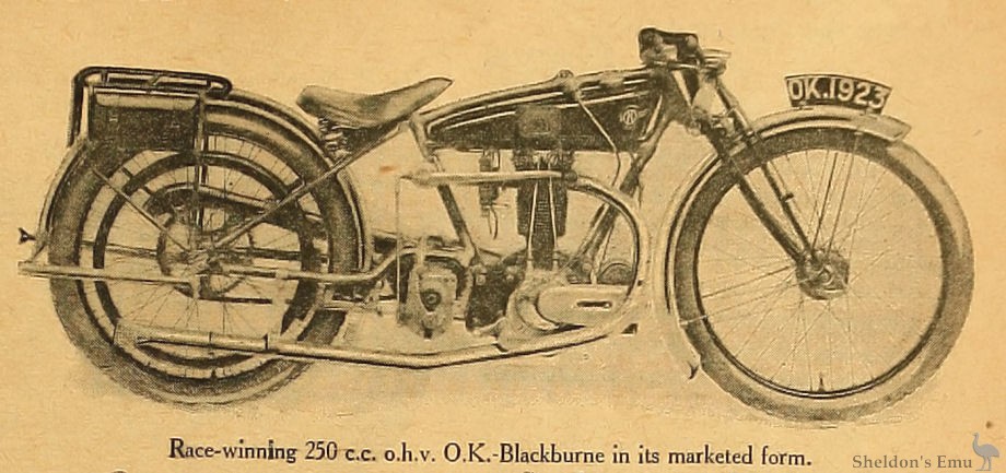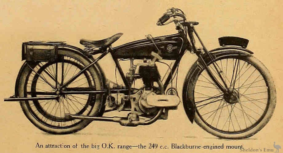 Few better examples of the 350 c.c. solo mount are to be seen in the Show than the 348 c.c. Blackburne-engined O.K. Built on thoroughly conventional lines, well mudguarded, and with many points of convenience well studied, it should appeal to the sporting rider. The gear box fixture is worthy of note, since not only is there a longitudinal adjustment by means of a drawbolt, but set screws allow a certain variation to be made so that perfect chain alignment may be ensured.