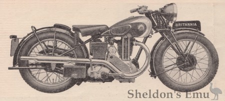 LIGHTING Lucas Magdyno, 6 volt, with the new large double filament head lamp and stop light at rear. brake controlled. Larger rubber suspended battery in universal carrier (Patent No. 21454/33), which allows for swinging out or quick detachment for topping up, etc. Every cable armoured.