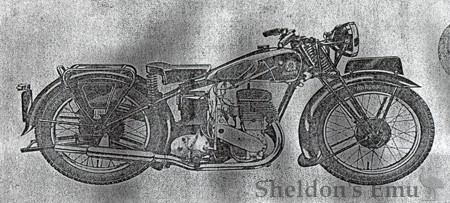 Engine unit 498cc JAP side valve engine, entirely new design. Cylinder barrel with detachable head and enclosed valve gear. Special proform cams giving high efficiency and perfect mechanical silence. Timed engine breather system, dry sump lubrication by double acting pump, pressure feed to roller bearing big end and extra heavy flywheels and robust mainshaft assembly. Engine shock absorber running in oil bath. Amal carburettor.