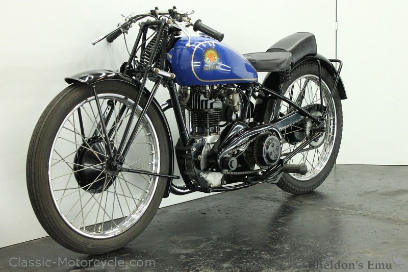 OK Supreme fitted their own 248cc engines in the early 1930s, retaining JAP engines for the larger capacities. Their OHC 250 took the IOM TT 250cc lap record in 1930, and this Lighthouse model was offered briefly as a road machine before the depression bit deeply and production slowed.