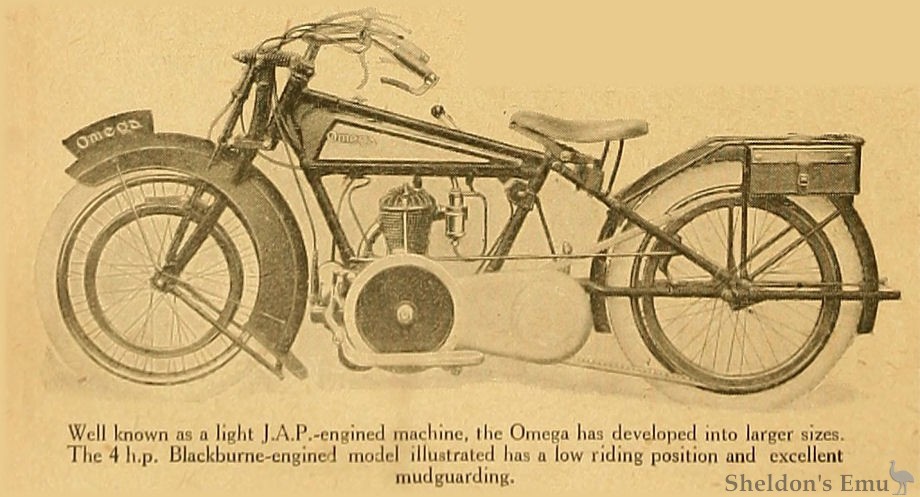 Well known as a light J.A.P.-engined machine, the Omega has developed into larger sizes. The 4 h.p. Blackburne-engined model illustrated has a low riding position and excellent mudguarding.