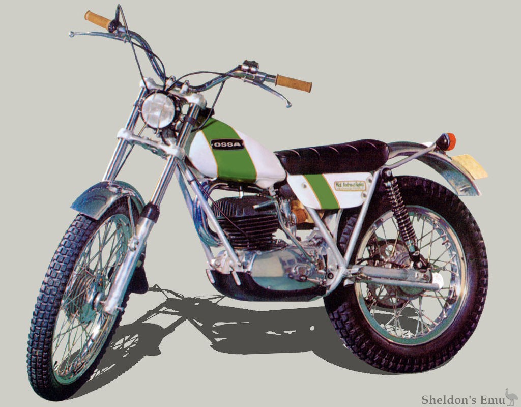 El motor sobrado de potencia y con unos bajos importantes va pintado en negro, no así el bastidor, que sale en gris plata y los colores elegidos para el deposito de fibra y tapas laterales son el blanco con bandas verdes cruzadas y fileteados dorados. En definitiva una estética y prestaciones muy conseguidas hacen vender a Ossa mas de 7.000 unidades en todo el mundo en menos de dos años.