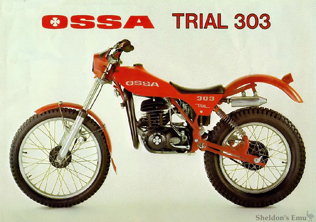 Tres años después y ya con Gorgot en las filas de Montesa y ganando campeonatos con las Cota, Ossa tenia que renovar su modelo de trial. Aparece la 303, aparentemente parecida pero cuando la miramos con detalle observamos grandes diferencias, el deposito es mas reducido con diferentes anclajes al bastidor, nuevo tapón de gasolina, el color es totalmente rojo e incorpora un porta faros ACERBIS para cumplir con las nuevas normativas del trial. El escape es nuevo aunque conserva los silenciosos de la 80 siendo el bastidor el cambio mas importante, cortado por la parte trasera y aunque vuelve a tener los tubos descendentes estos van soldados pare evitar vibraciones.