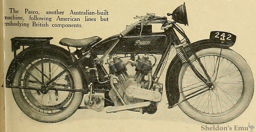 The second machine is a J.A.P.-engined model known as the Pasco, and is manufactured by Messrs. McCrae and Pasco, 242, Elizabeth Street, Melbourne, Victoria.