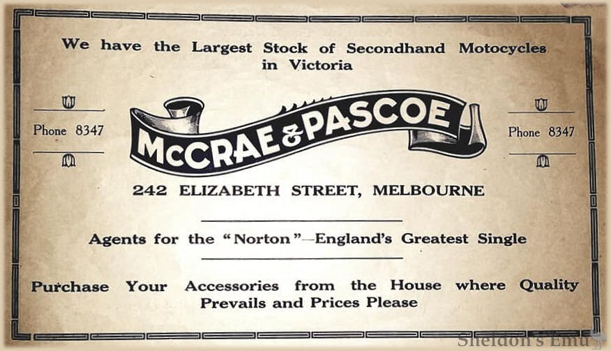 Mcray and Pascoe 242 Elizabeth Street, show on stand No. 39 solo models of the Norton machines of 3½ hp, for touring and speed work, also a colonial type with a more massive frame, of 3½ h p, with all all-chain drive, find well suited to Australian conditions. There is a larger model - the Big 4 - really a 6hp mount - for sidecar use, while the "Baby" Velocette with 2½ h p , two-stroke engine, completes the display.