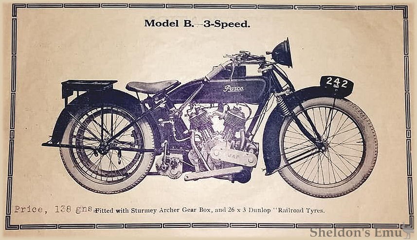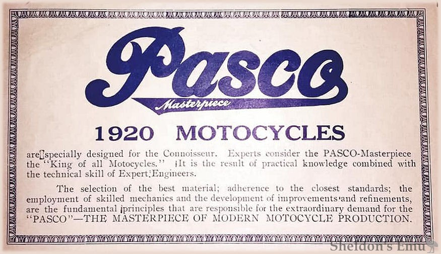 The selection of the best material; adherence to the closest standards; the employment of skilled mechanics and the development of improvements and refinements, are the fundamental principles that are responsible for the extraordinary demand for the "PASCO" - THE MASTERPIECE OF MODERN MOTOCYCLE PRODUCTION.