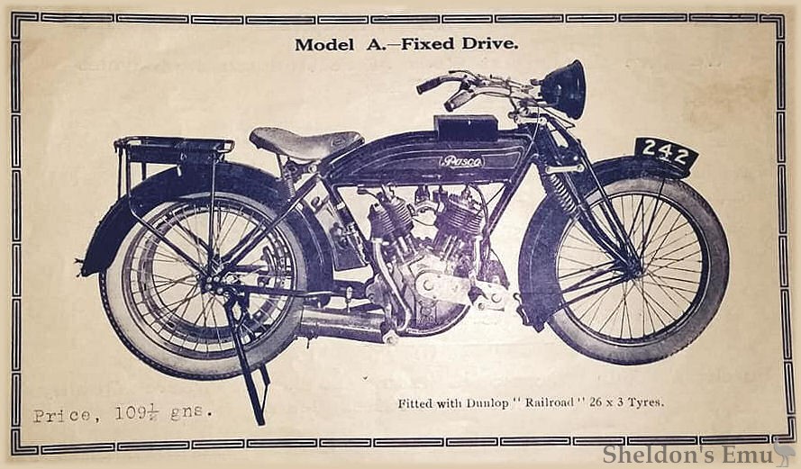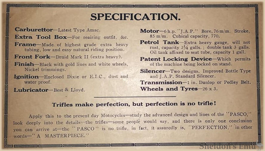 Apply this to the present day Motorcycles - study the advanced design and lines of the "PASCO," look deeply into the details - the trifles - some people would say, and there is only one conclusion you can arrive at - the "PASCO" is no trifle, in fact, it assuredly is, "PERFECTION," in other words - "A MASTERPIECE."